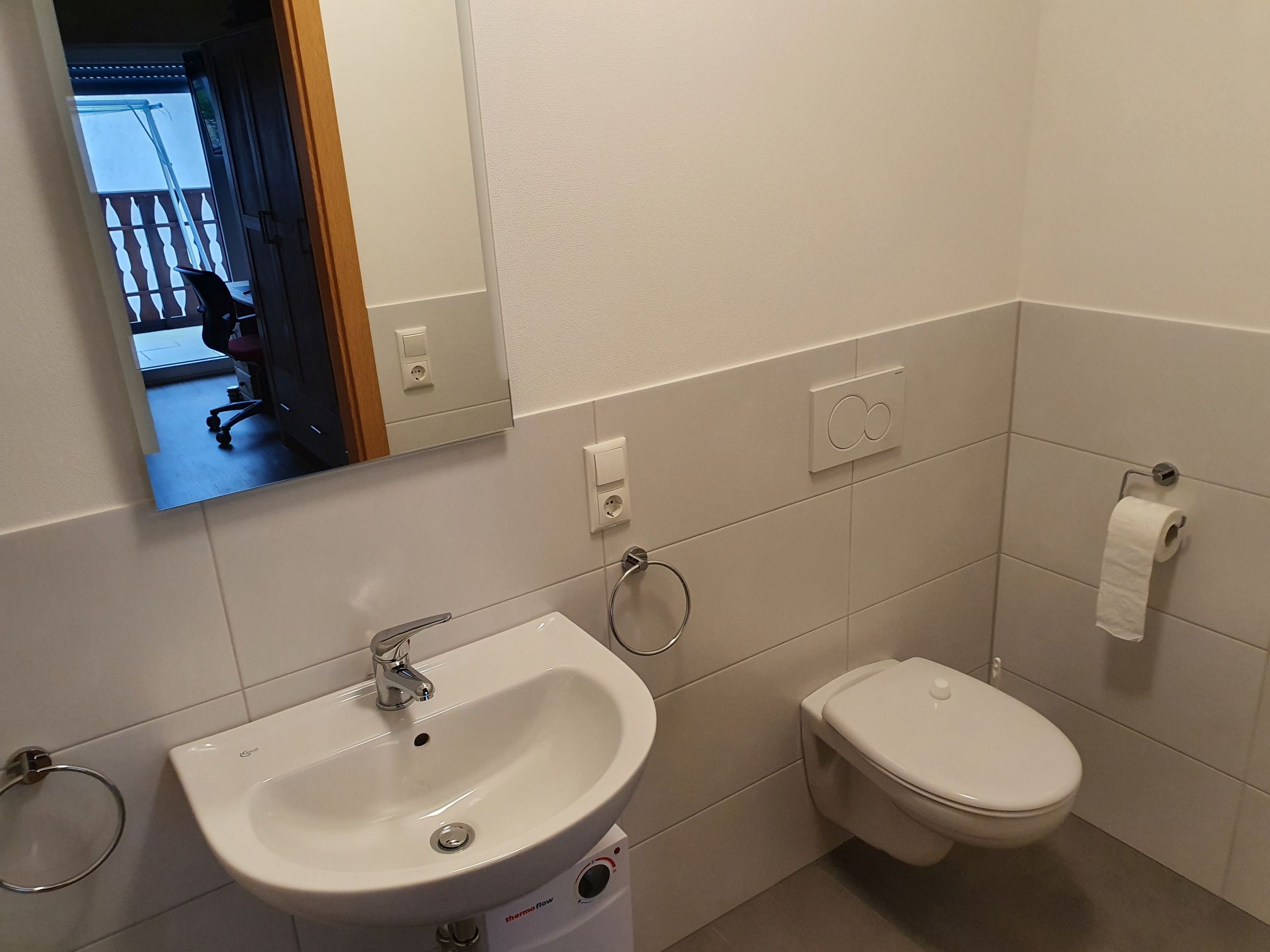 Ein geräumiges Badezimmer mit Dusche und WC ist über den Flur erreichbar. Ein weiteres WC grenzt an eines der beiden Schlafzimmer und ist nur über dieses erreichbar. Die Handtücher sind ebenfalls im Mietpreis enthalten.