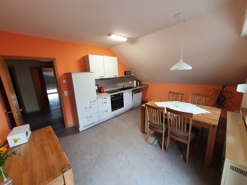 In der komplett ausgestatteten Küche inkl. hochwertiger Elektrogeräte befindet sich ein Essbereich, der Platz für bis zu 4 Personen zzgl. Kinderhochstuhl bietet. Das darin enthaltene Internetradio sorgt sowohl in den Morgenstunden als auch beim gemütlichen Zusammensitzen am Abend für musikalische Unterhaltung. In der Küche befinden sich neben der Spülmaschine inkl. Spülmittel unter anderem auch Waschmaschine und Trockner.